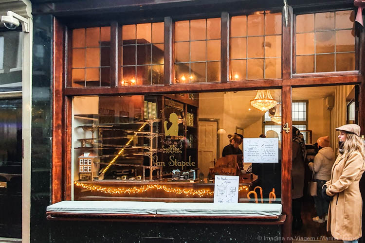 Saia do Begijnhof pela praça Spui (a saída pela Spui fica bem do ladinho da Houten Huis), vire à direita e siga até o final da praça, entrando na Heisteeg. Fica nessa rua estreitinha a Van Stapele, loja conhecida por ter os melhores cookies de Amsterdam (na minha opinião, de toda a vida, do universo). Há apenas um tipo de cookie ali, com massa de chocolate amargo crocante e recheio de chocolate branco cremoso. É de comer rezando! É possível que você encontre uma pequena fila na porta da Van Stapele, porque a loja é pequena e MUITO procurada – são mais de 3 mil cookies vendidos todos os dias! Mas costuma ser rápido e vale a pena esperar. Os biscoitos são assados ao longo do dia inteiro e a cada 10 minutos sai uma nova fornada, o que significa que você sempre vai encontrar um cookie quentinho quando chegar lá.